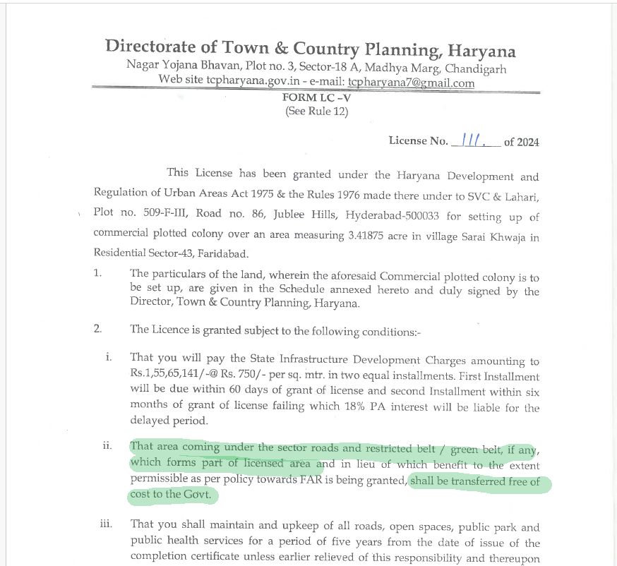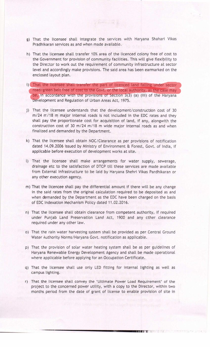 हरियाणा शहरी क्षेत्र विकास एवं विनियमन अधिनियम, 1975 के अनुसार अगर किसी बिल्डर के प्रोजेक्ट  की जमीन का कुछ भाग सेक्टर डिवाइडिंग रोड पर आ रहा है तो लाइसेंस लेने से पहले उस बिल्डर को जमीन का वो भाग सड़क के लिए छोड़ना पड़ेगा और वो भाग सरकार को फ्री ऑफ कोस्ट ट्रांसफर करना पड़ेगा तभी उस प्रोजेक्ट को डीटीपी विभाग द्वारा पर्मिशन दी जाएगी ।