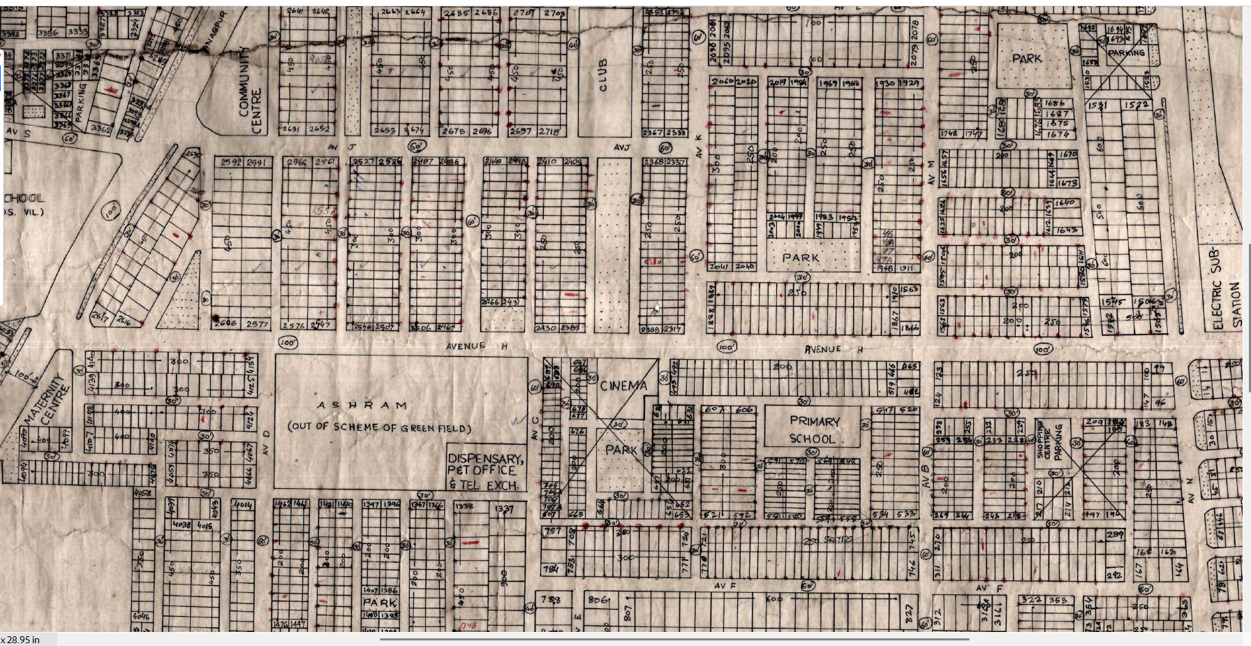 ग्रीनफील्डस कॉलोनी का 1994 का अप्रूव्ड ले आउट प्लान जिसमे इस सेक्टर विभाजीय मार्ग को 30 मीटर ( 100 फुट ) दर्शाया है :